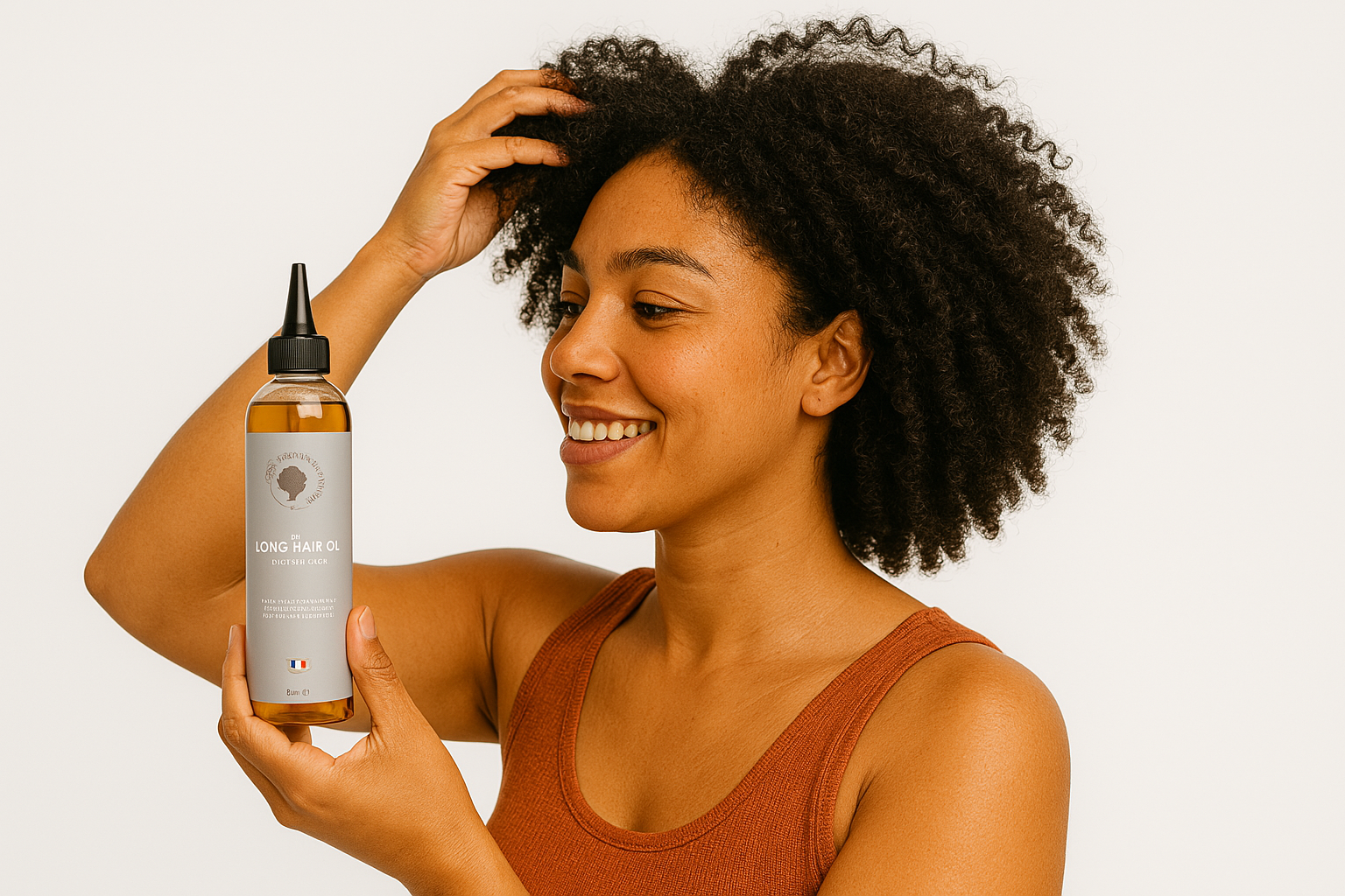 Notre Huile de Croissance Capillaire agit en nourrissant en profondeur les follicules capillaires avec une formule riche en ingrédients naturels. Elle stimule la circulation sanguine, renforce les racines et favorise une croissance saine des cheveux, tout en prévenant la casse et les pointes fourchues.